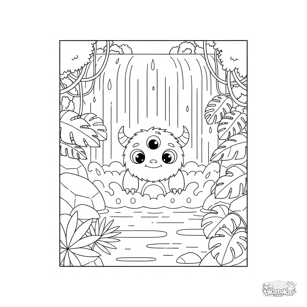 Página para colorir de um monstro amigável de três olhos espiando de trás de uma cachoeira na selva. Para crianças de 6-9 anos. Cena detalhada com trepadeiras, pedras e plantas.