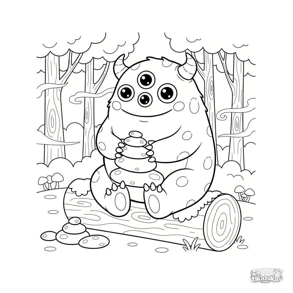 Página para colorir de um monstro amigável de três olhos em uma floresta. Para crianças de 4 a 6 anos. O monstro senta em um tronco empilhando pedras.
