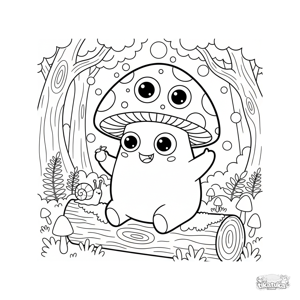 Página para colorir de um monstro cogumelo de três olhos amigável em uma floresta encantada. Para crianças de 4 a 6 anos. Cena simples com contornos claros.