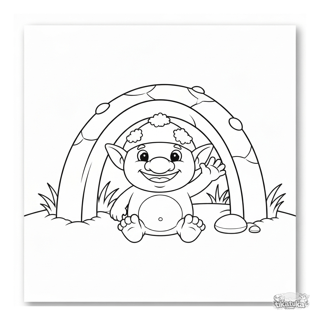 Página para colorir para crianças: um troll amigável senta-se sob uma ponte mágica de cogumelo. Desenho simples com grandes detalhes.