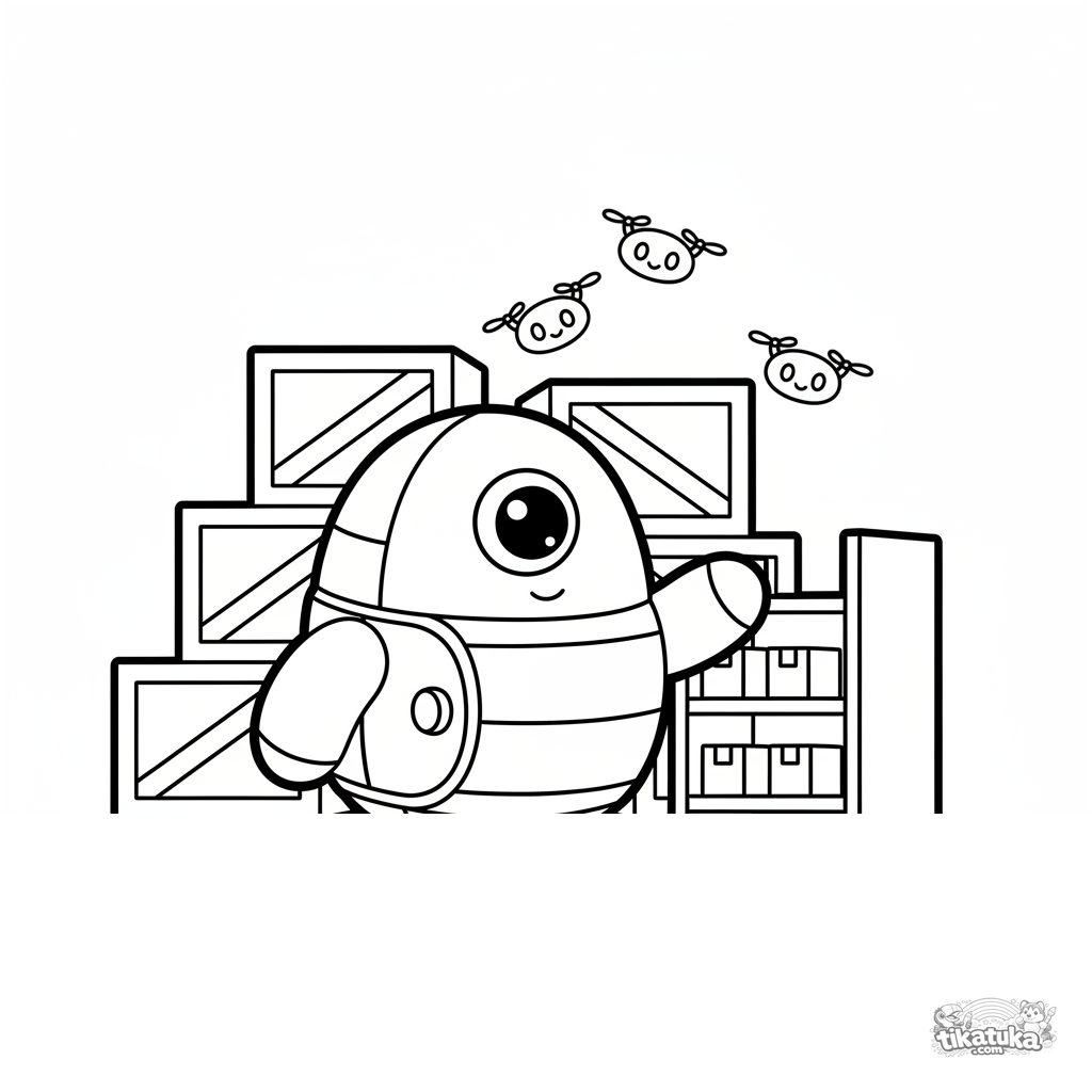 Página para colorir para crianças de 2-3 anos: um robô redondo e amigável organizando caixas em um armazém com prateleiras e drones voadores. Formas simples, margens amplas.