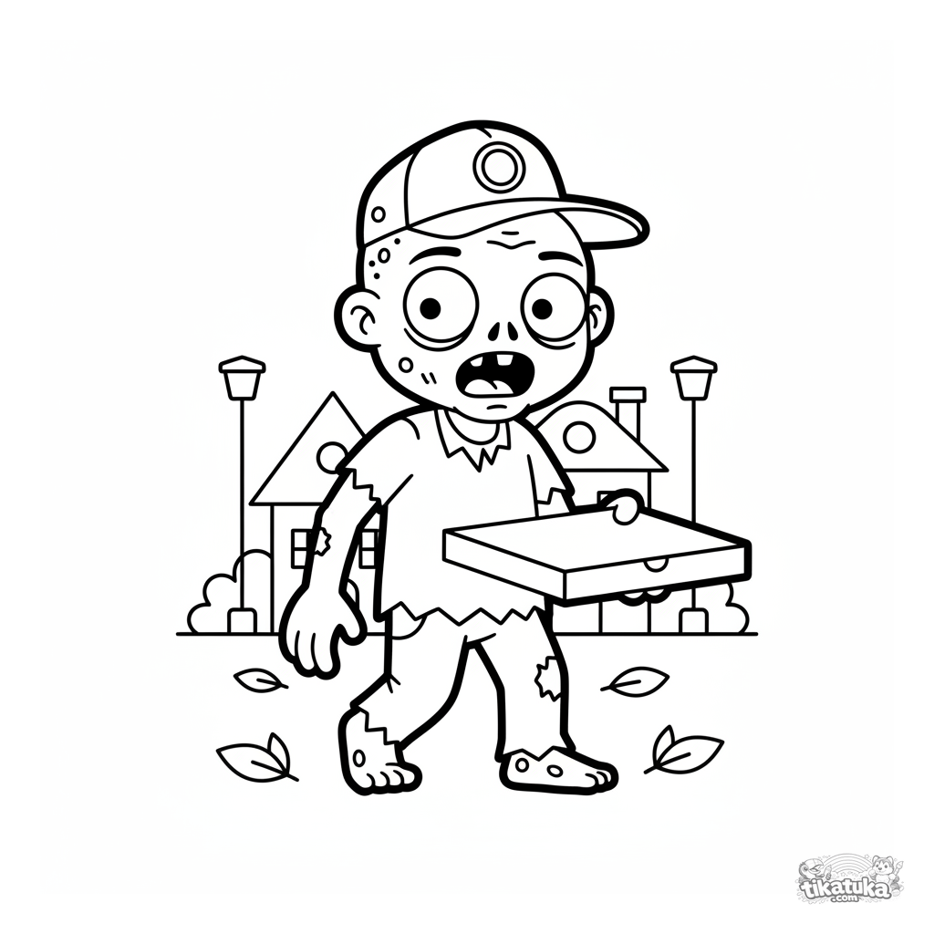 Página simples para colorir um zumbi amigável para crianças de 2-3 anos. Formas grandes, um entregador zumbi carregando uma caixa de pizza numa rua ao anoitecer.