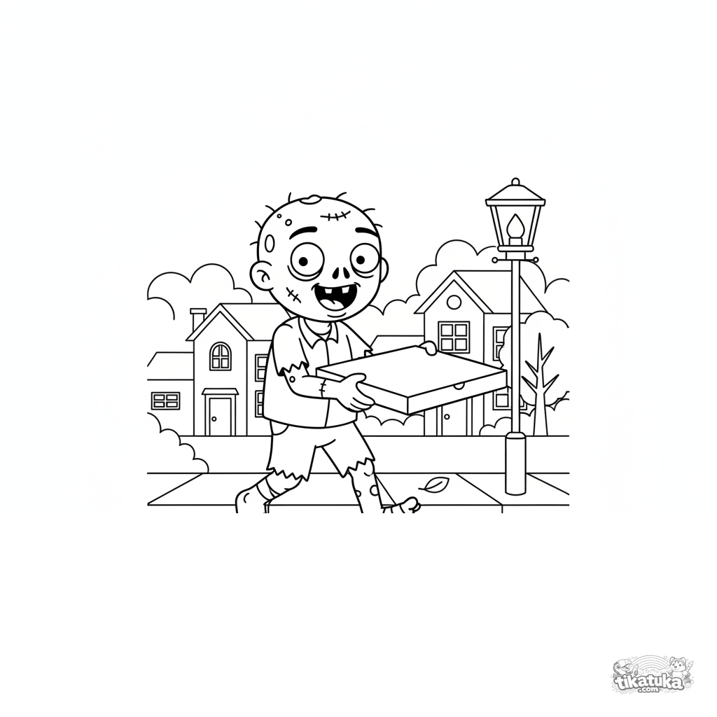 Página para colorir de um zumbi entregador amigável. Para meninos de 4 a 6 anos. Um zumbi alegre está carregando uma caixa de pizza por uma rua tranquila ao anoitecer.