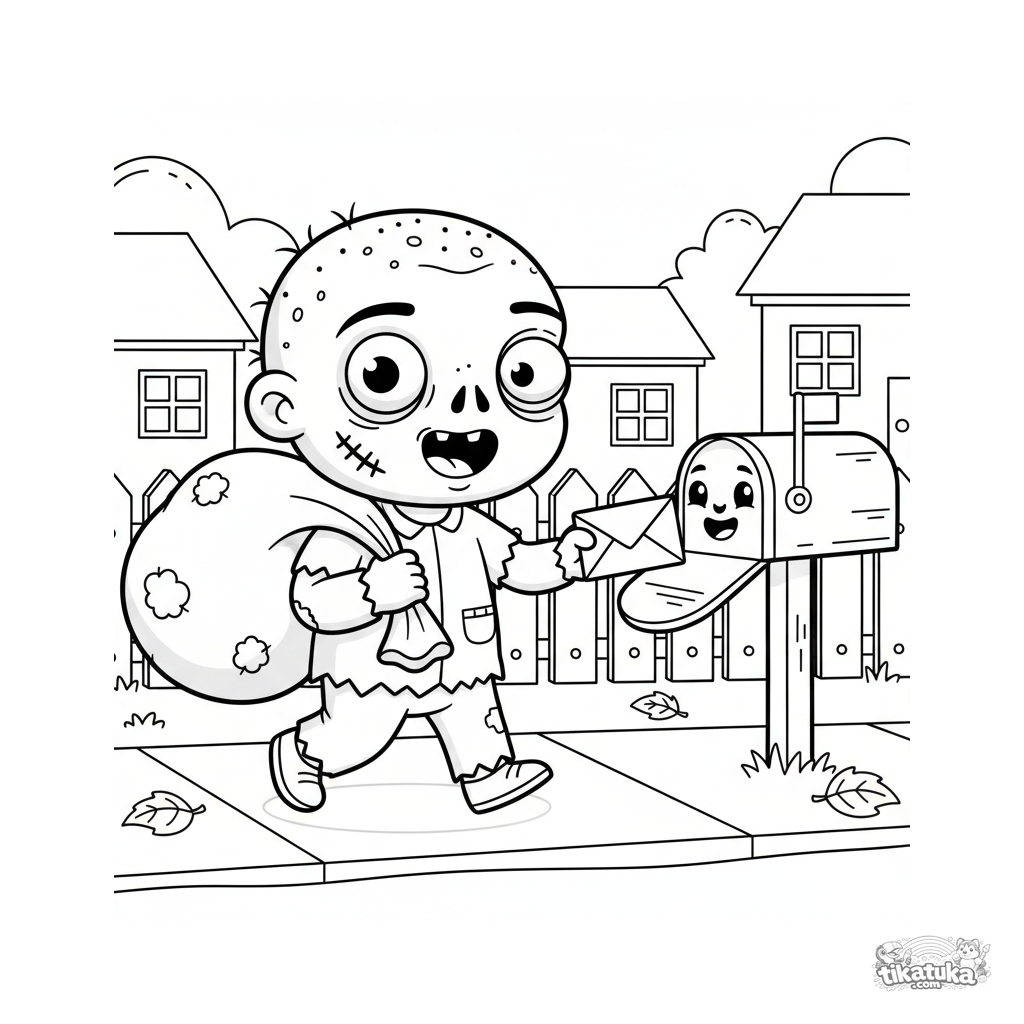 Página para colorir para meninos de 4-6 anos. Zumbi carteiro bobo e amigável entregando cartas numa rua. Cena de monstro divertida e não assustadora.