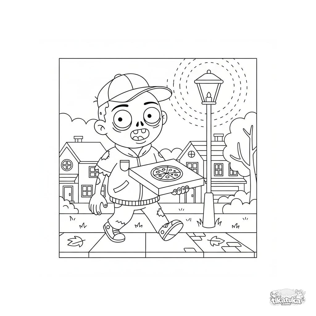 Página divertida para colorir para meninos: um zumbi entregador de pizza amigável. Personagem engraçado, não assustador, com detalhe moderado.