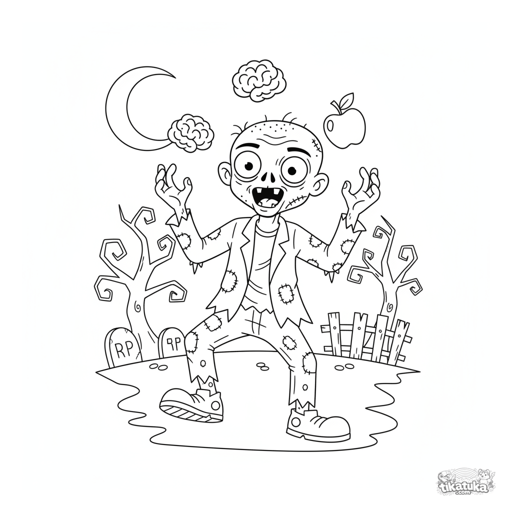 Uma página para colorir de Zumbis com nível Médio. Ela combina com a idade 4-6 anos, imprime bem em casa e abre imediatamente no modo online.