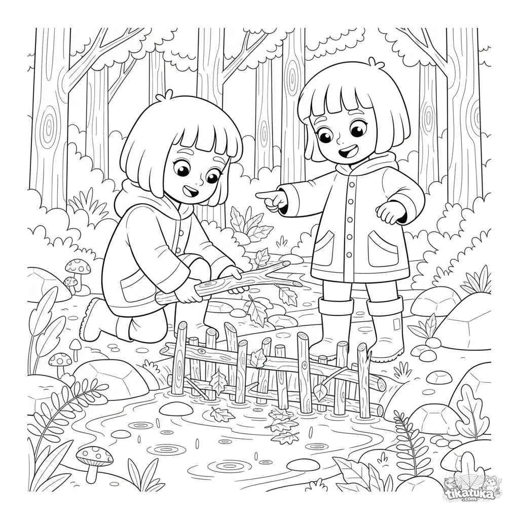 Página para colorir para crianças de 10-12 anos: dois amigos de capa de chuva constroem uma represa de folhas em um riacho na floresta na chuva de outono. Cena detalhada.