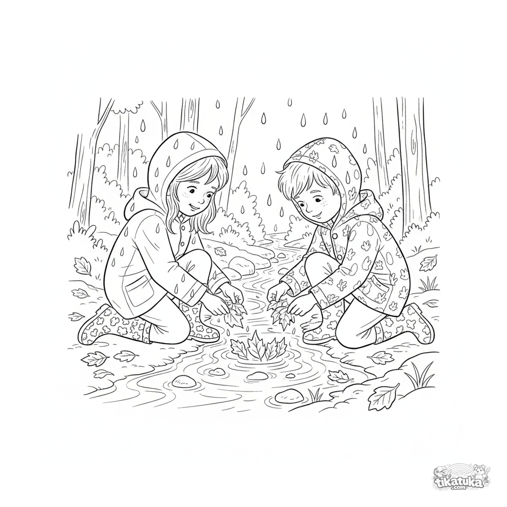 Página para colorir para crianças maiores 10-12: dois amigos de capa de chuva constroem uma represa de folhas no riacho.