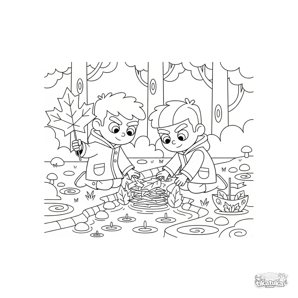Página para colorir para crianças 7-9 anos: dois amigos de capa de chuva constroem uma represa de folhas perto de um riacho no outono. Cena dinâmica.