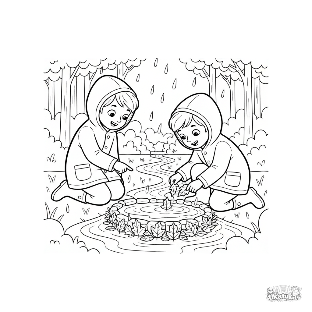 Página para colorir para crianças (7-9 anos): dois amigos com capas de chuva constroem uma represa de folhas em um riacho de outono na chuva. Cena de ação com detalhes.