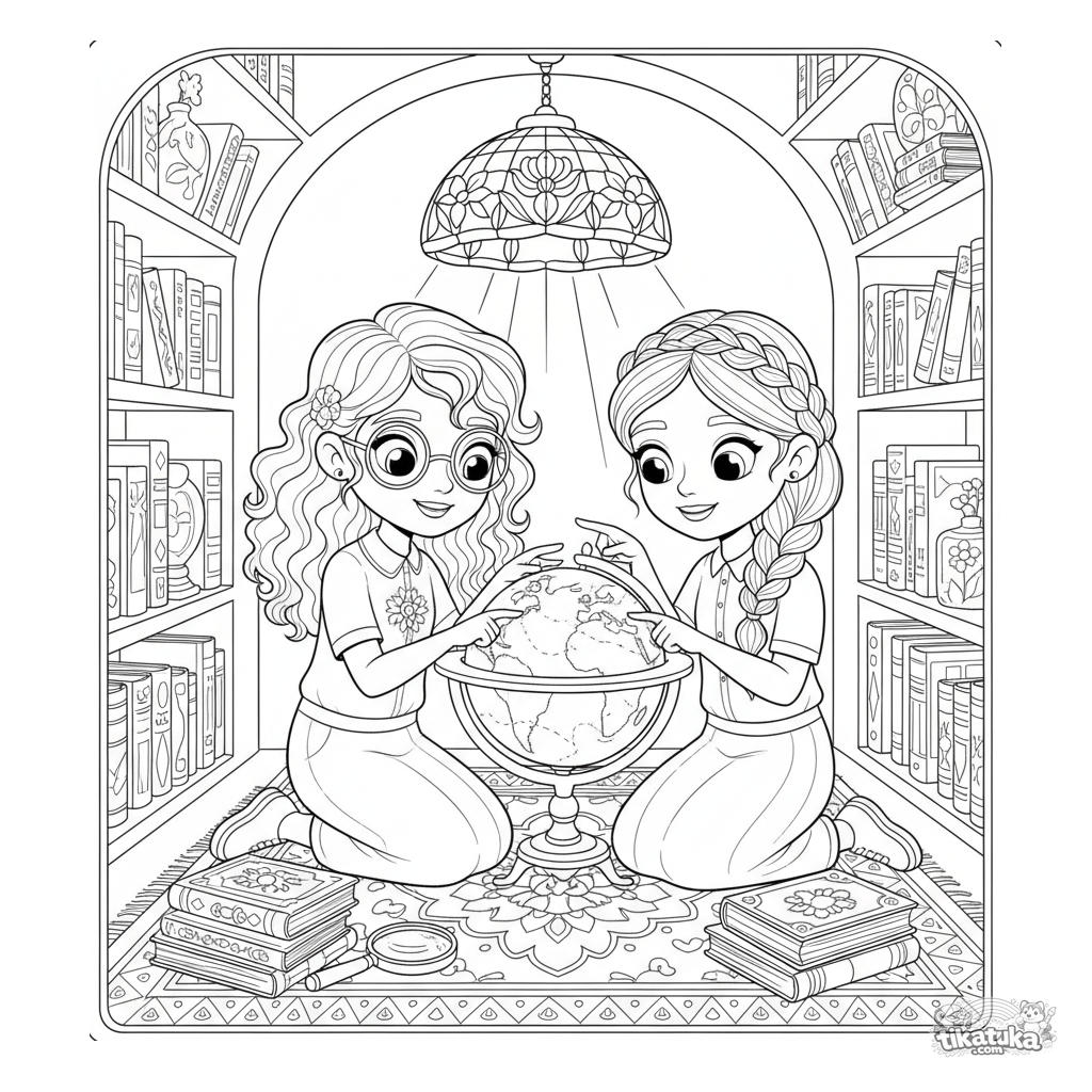 Página para colorir para crianças mais velhas 10-12: duas amigas em um cantinho aconchegante da biblioteca de um salão festivo examinam um globo antigo. Alto nível de detalhe, elementos decorativos art nouveau lite.