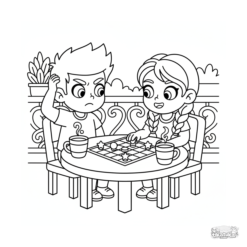 Página para colorir para crianças de 7-9 anos: dois amigos jogam um jogo de tabuleiro em uma mesinha na varanda de verão. Canecas de chá, emoções expressivas.