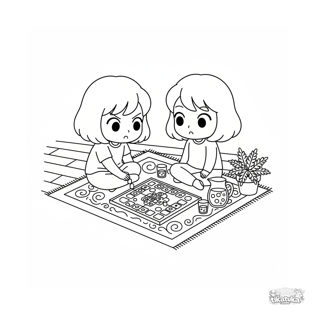 Página para colorir para crianças de 7-9 anos: dois amigos jogam um jogo de tabuleiro num tapete na varanda de uma casa de verão. Cena com jarro de limonada.