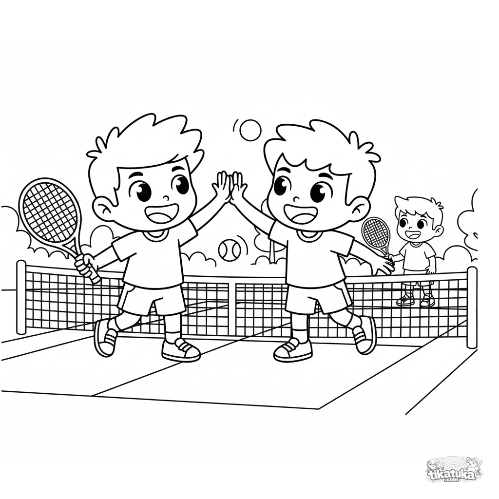 Página para colorir para crianças 7-9: dois pares de amigos jogam tênis em duplas, um par comemorando um ponto. Cena dinâmica com rede e raquetes.