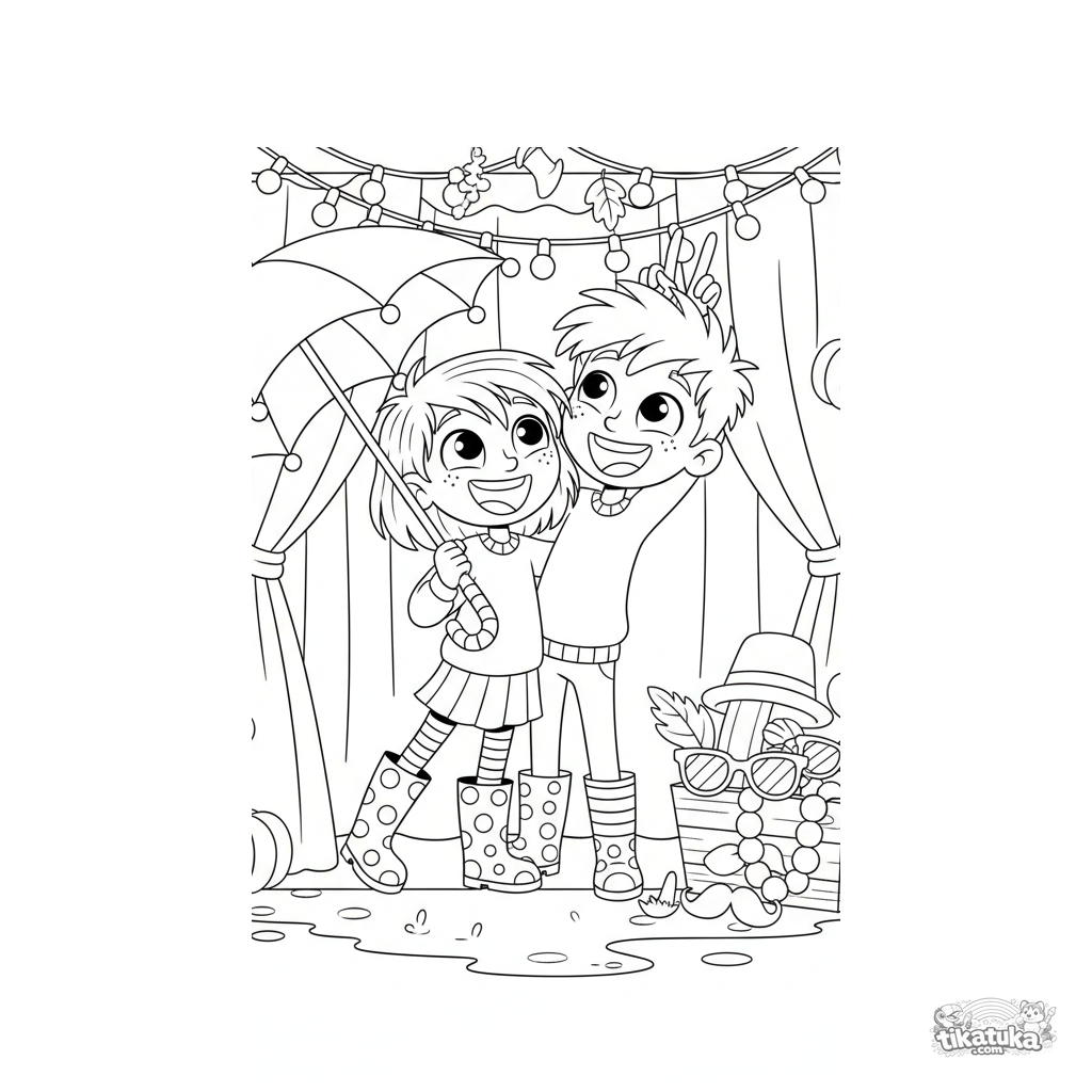 Página para colorir para pré-adolescentes de 7-9 anos: dois amigos se divertindo em uma cabine de fotos em uma feira de outono chuvosa. Poses expressivas, fundo moderado.