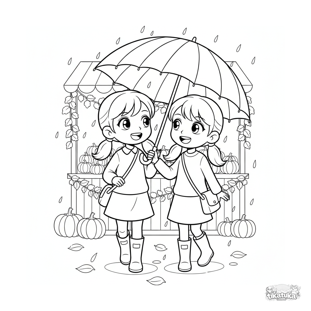 Página para colorir para crianças de 7-9 anos: dois amigos compartilhando guarda-chuva caminham na chuva ao lado de uma barraca de feira de outono. Detalhe moderado, poses expressivas.