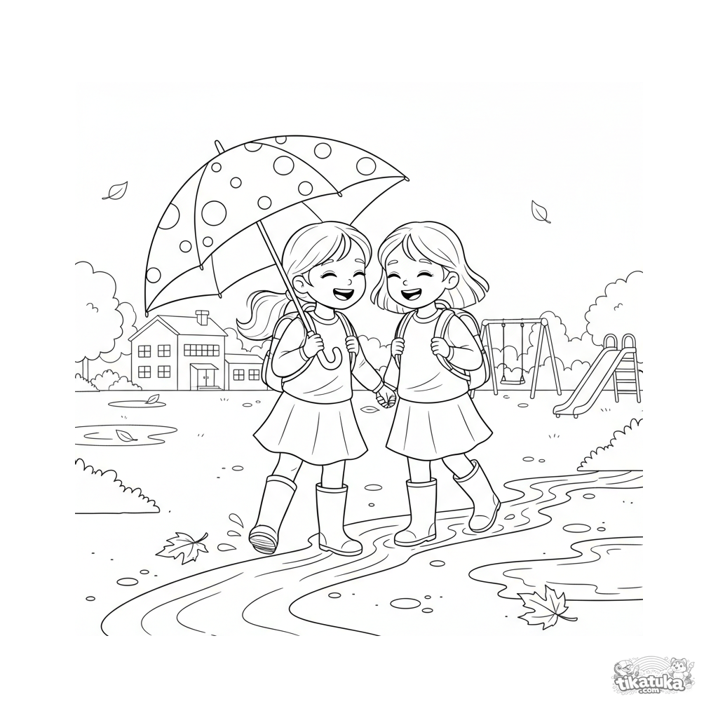 Página para colorir para crianças de 7-9 anos: dois amigos compartilhando um guarda-chuva caminham pelo pátio da escola molhado no outono. Cena com clima, detalhe moderado.