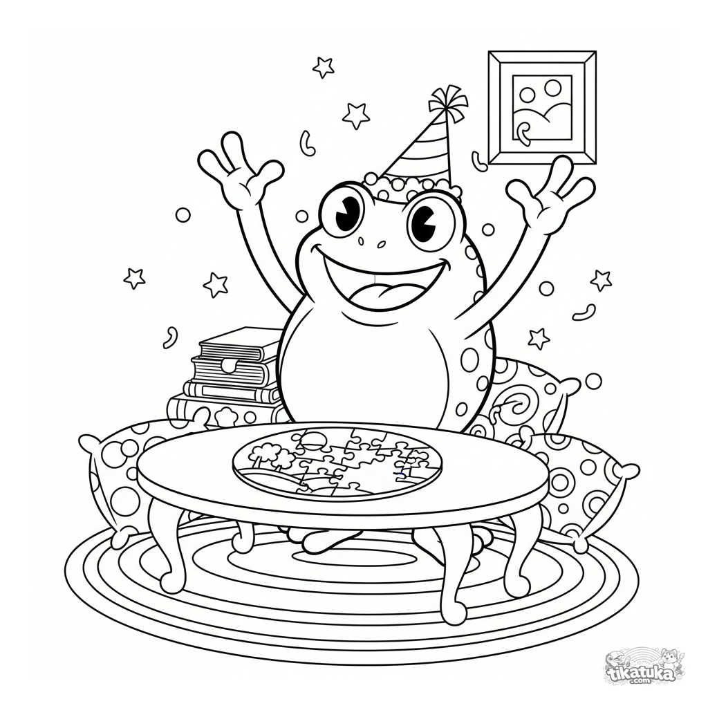 Página para colorir para crianças 7-12: um sapo alegre com chapéu de festa celebra a vitória sobre um quebra-cabeça cedo demais, faltando a última peça. Cena absurda e engraçada.