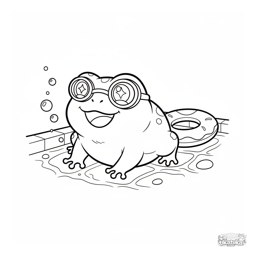 Página para colorir de um sapo mergulhador com óculos no fundo da piscina. Para crianças de 7 a 9 anos.
