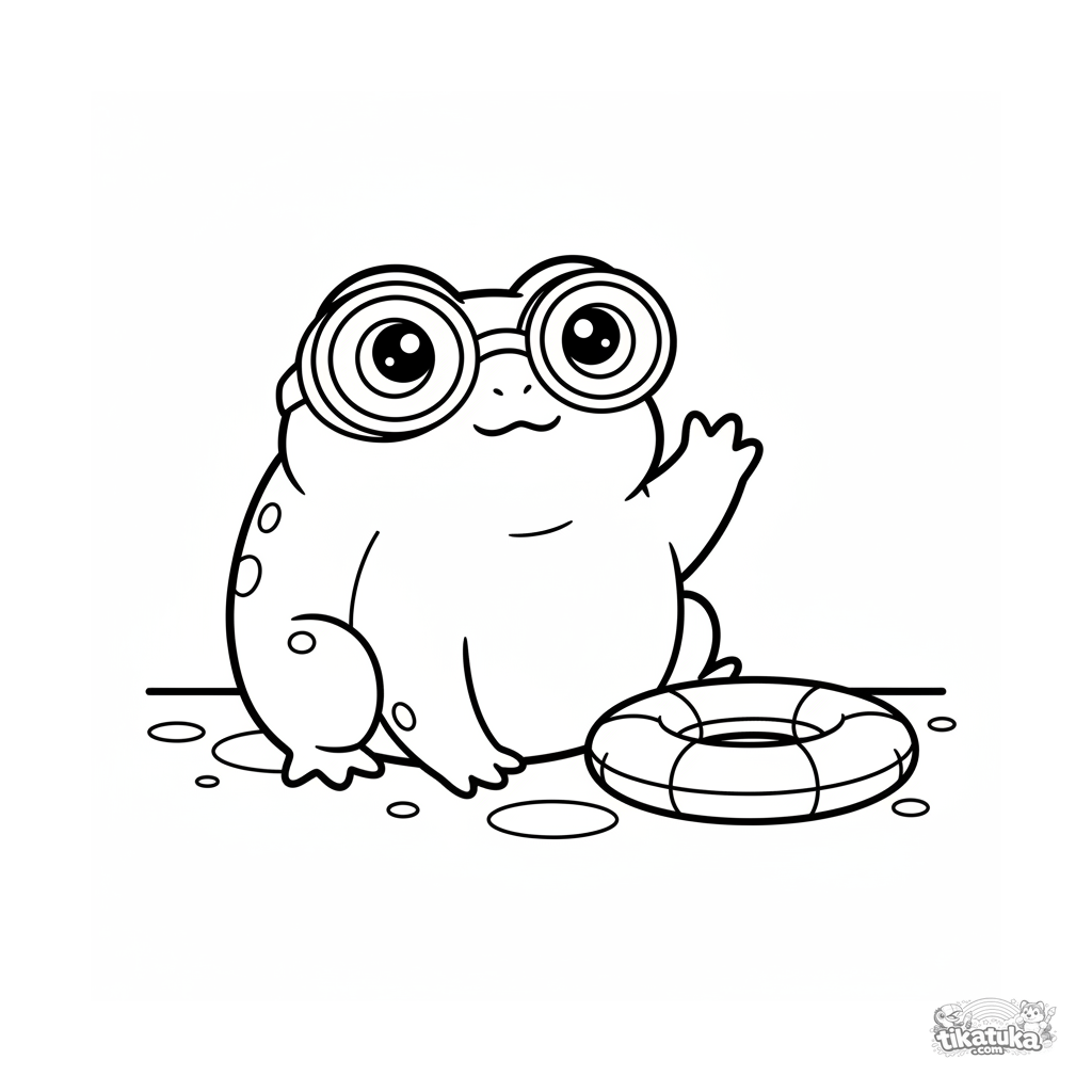 Página para colorir para bebês 2-3: um sapo com óculos sentado no fundo da piscina. Formas grandes e simples, poucos detalhes.