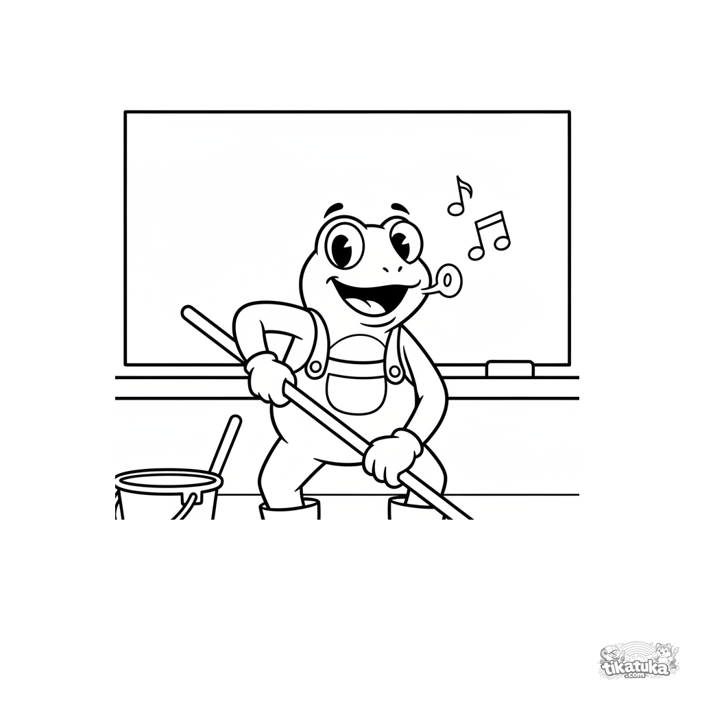 Página para colorir para crianças pequenas 2-3: um zelador sapo alegre com macacão esfrega o chão sob o quadro da escola na sala de aula, formas simples.