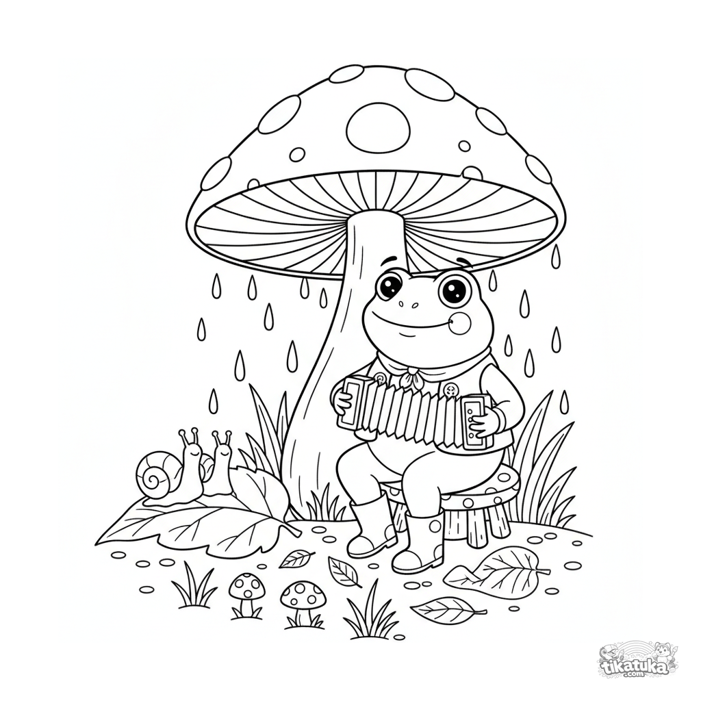 Página para colorir para crianças 4-6 anos em estilo folclórico: um sapo de colete e botas toca um acordeão sob um cogumelo gigante na chuva.