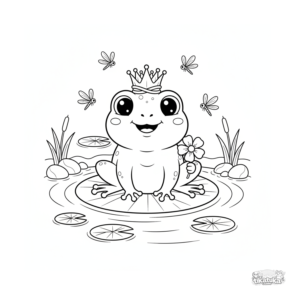 Página para colorir para crianças 4-6: um sapo alegre usando uma coroa de junco sentado em uma vitória-régia perto de um riacho. Estilo chibi fofo, libélulas, uma flor.