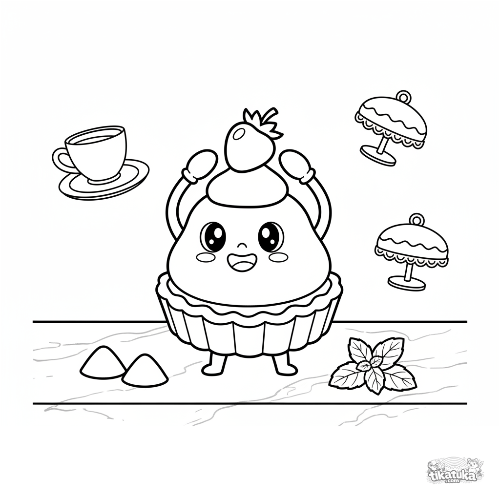 Página para colorir: uma torta de frutas equilibra uma fruta vermelha no balcão de mármol de uma cafeteria. Cena engraçada com açúcar de confeiteiro e hortelã. Para 4-6 anos.