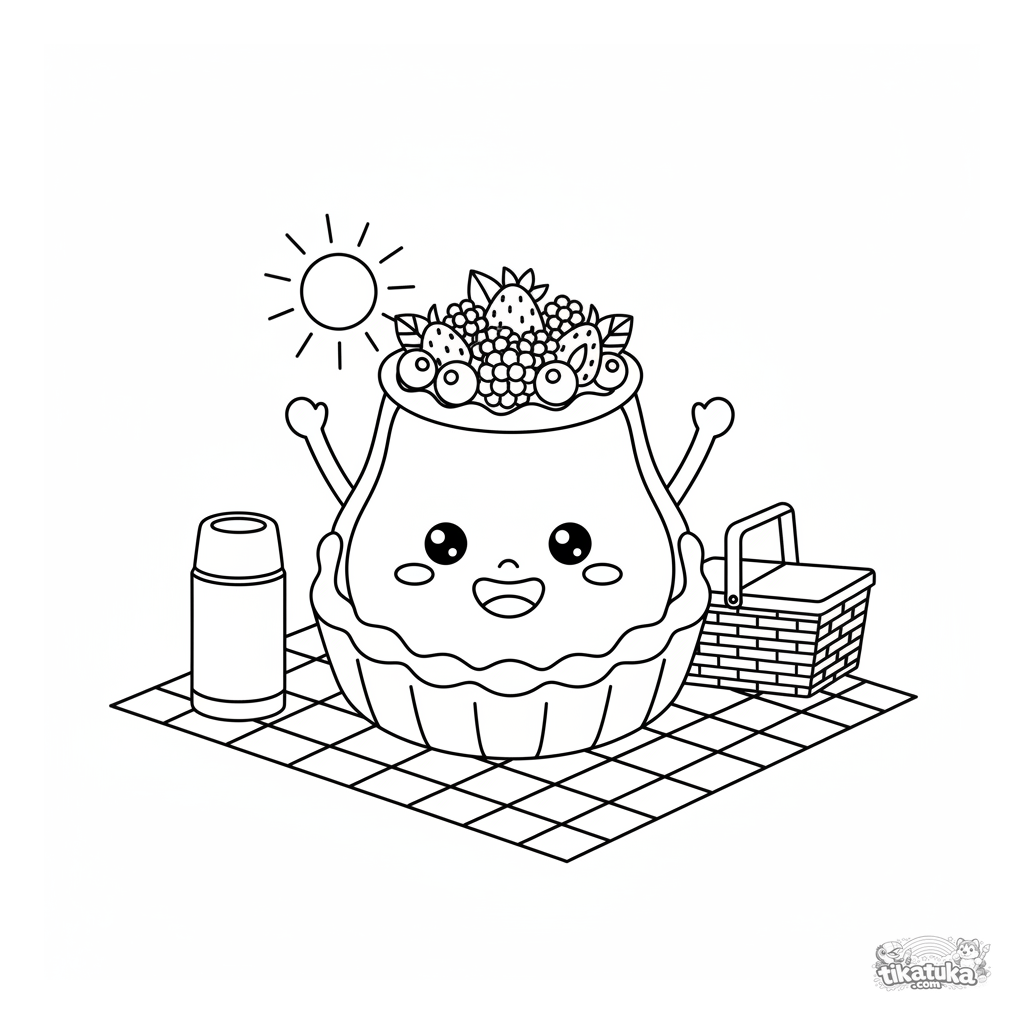 Página para colorir para crianças: uma torta de frutas feliz com frutinhas celebra em um piquenique. Cena colorida com um cobertor xadrez para diversão criativa de crianças de 4 a 6 anos.