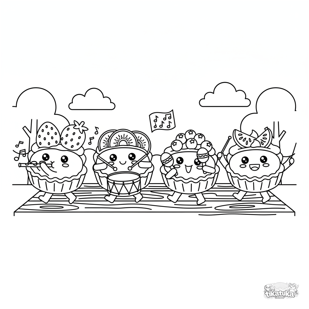 Página para colorir de uma banda de tortas de frutas marchando. Sobremesas felizes tocando instrumentos. Para crianças de 4-6 anos.