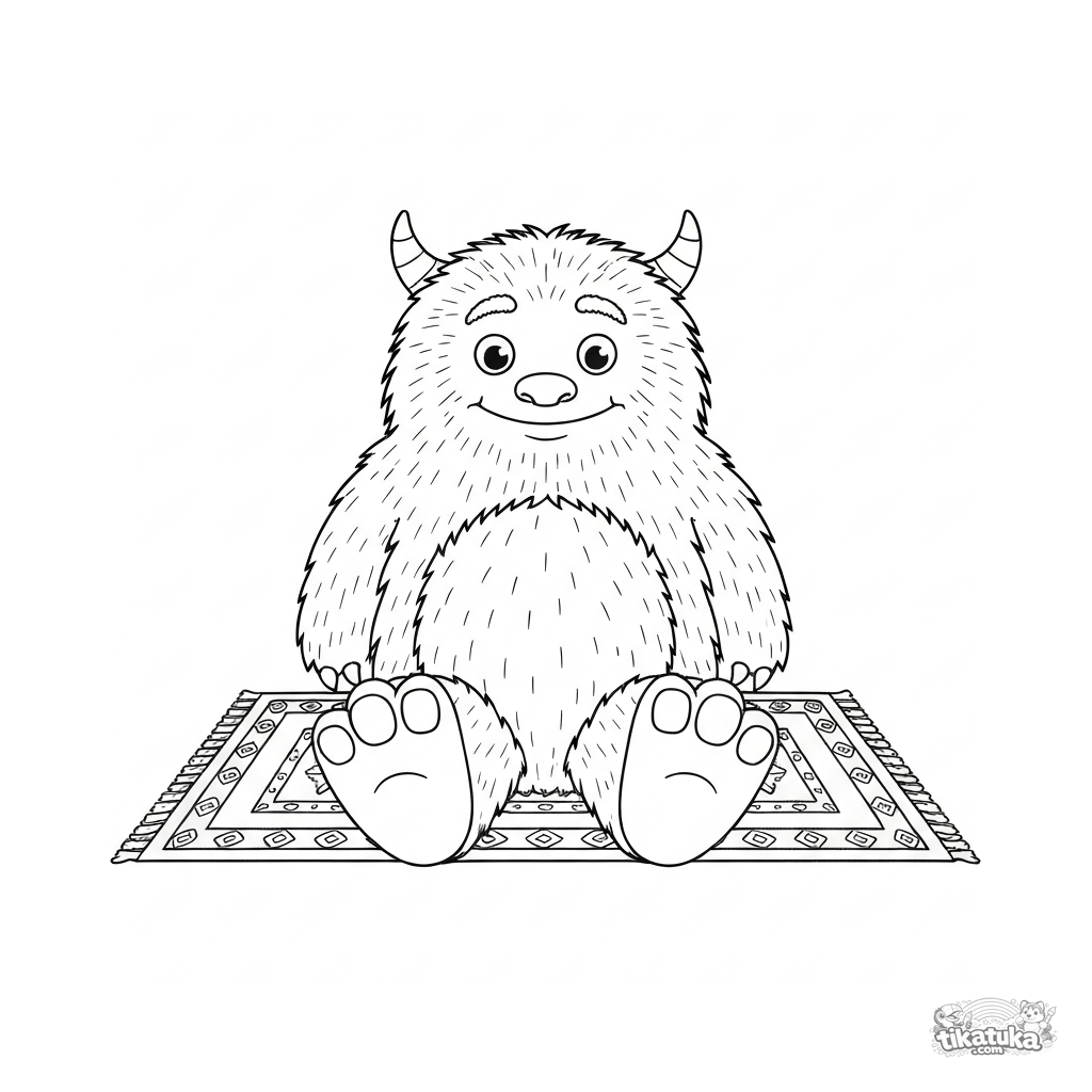 Página para colorir para crianças. Um monstro peludo amigável com pés enormes sentado em um tapete pequeno. Design simples. Download grátis.