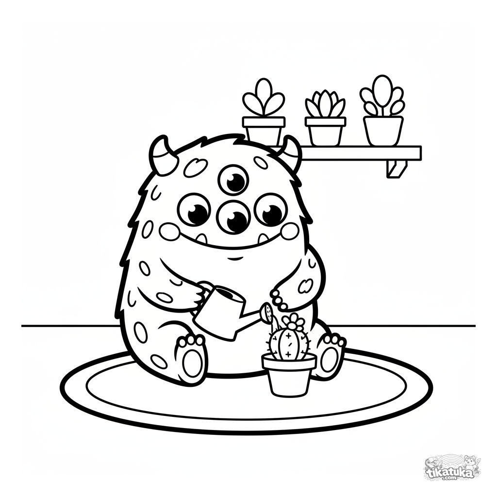 Página para colorir para os bem pequenos: um monstro peludo e gentil com três olhos rega um cacto florido. Formas muito simples e grandes para 2-3 anos.