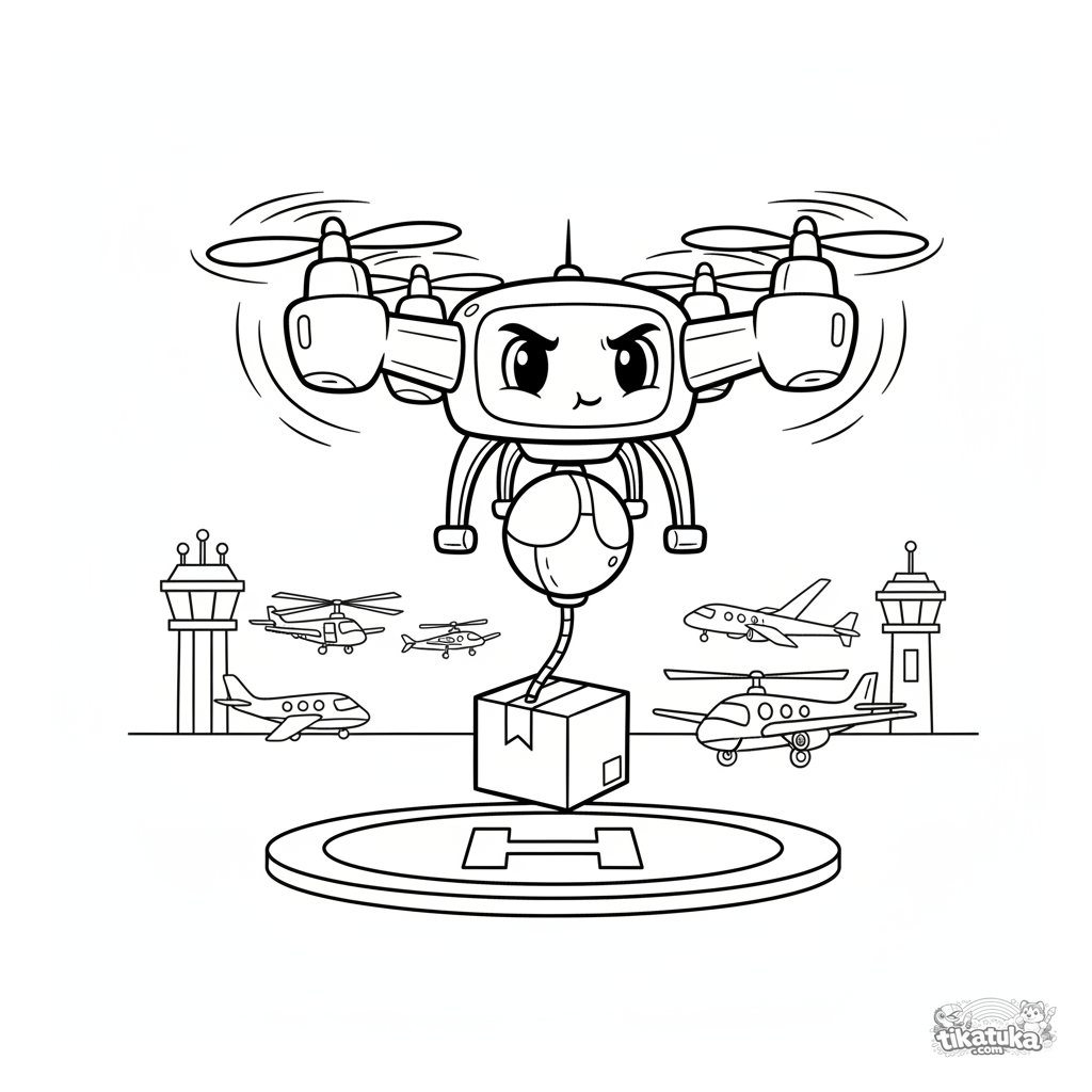 Página para colorir para crianças de 4-6 anos: um drone de entrega futurista em um aeródromo. A máquina inteligente abaixa cuidadosamente um pacote. Formas geométricas claras e detalhes interessantes para colorir.