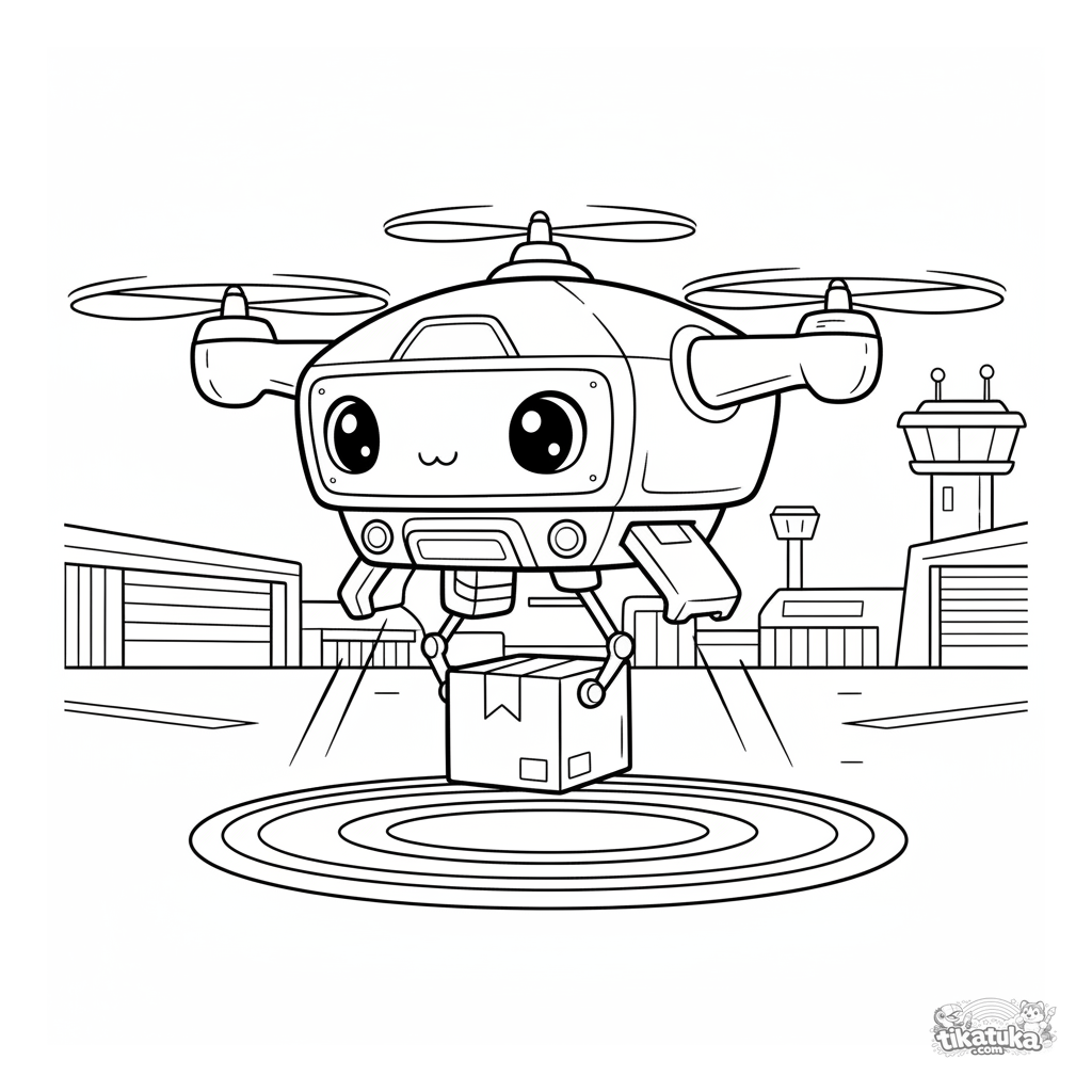 Página para colorir para meninos: um drone de entrega futurista pairando sobre um aeródromo. Formas geométricas claras.