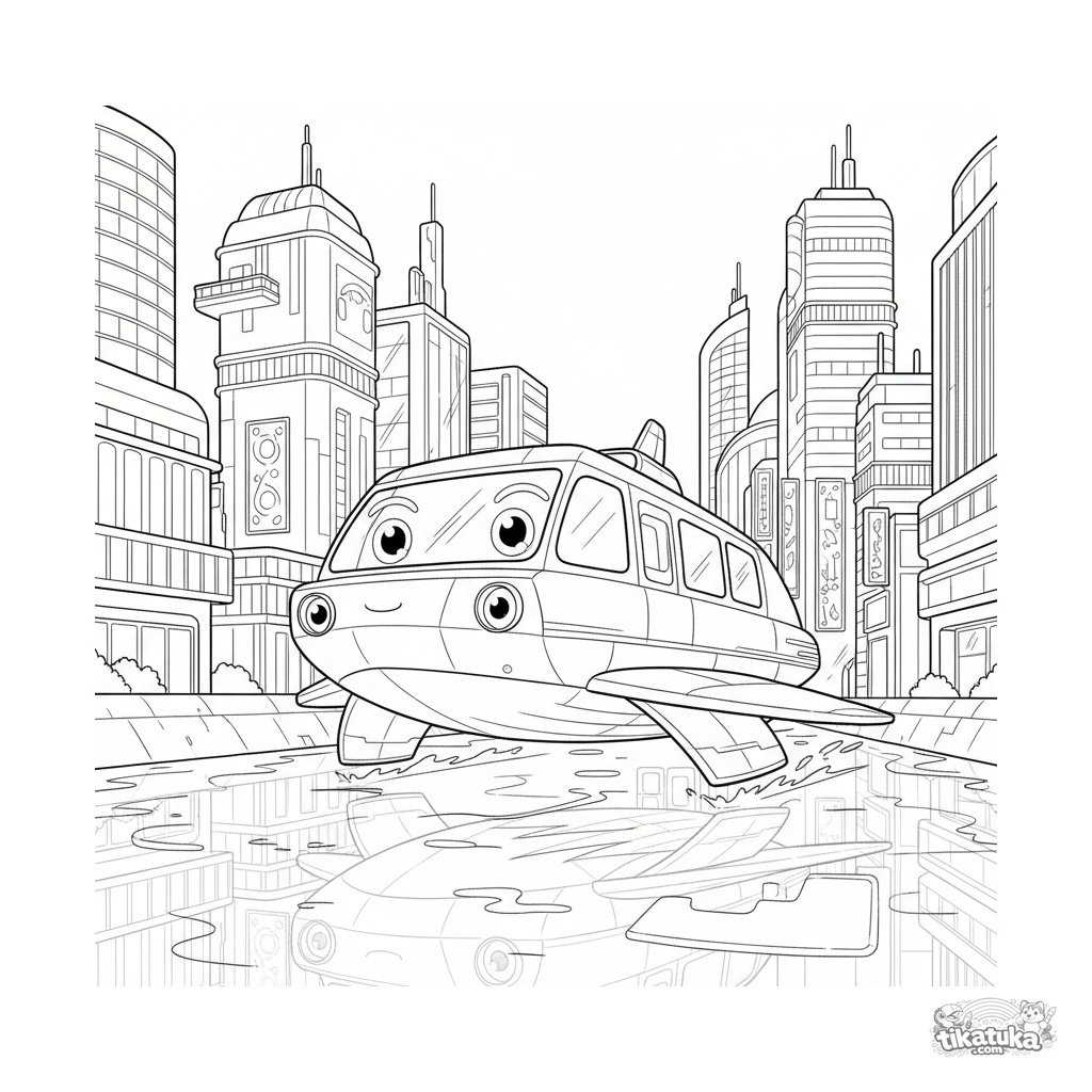 Página para colorir detalhada para 10-12 anos: uma balsa hidrofólio futurista desliza por um canal urbano iluminado por néon.
