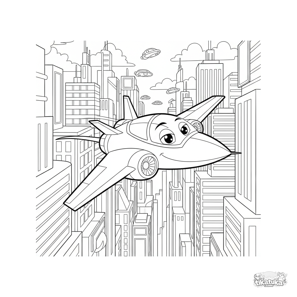 Página para colorir de um jato futurista fazendo curva entre arranha-céus em uma cidade de néon. Para crianças de 7 a 9 anos.