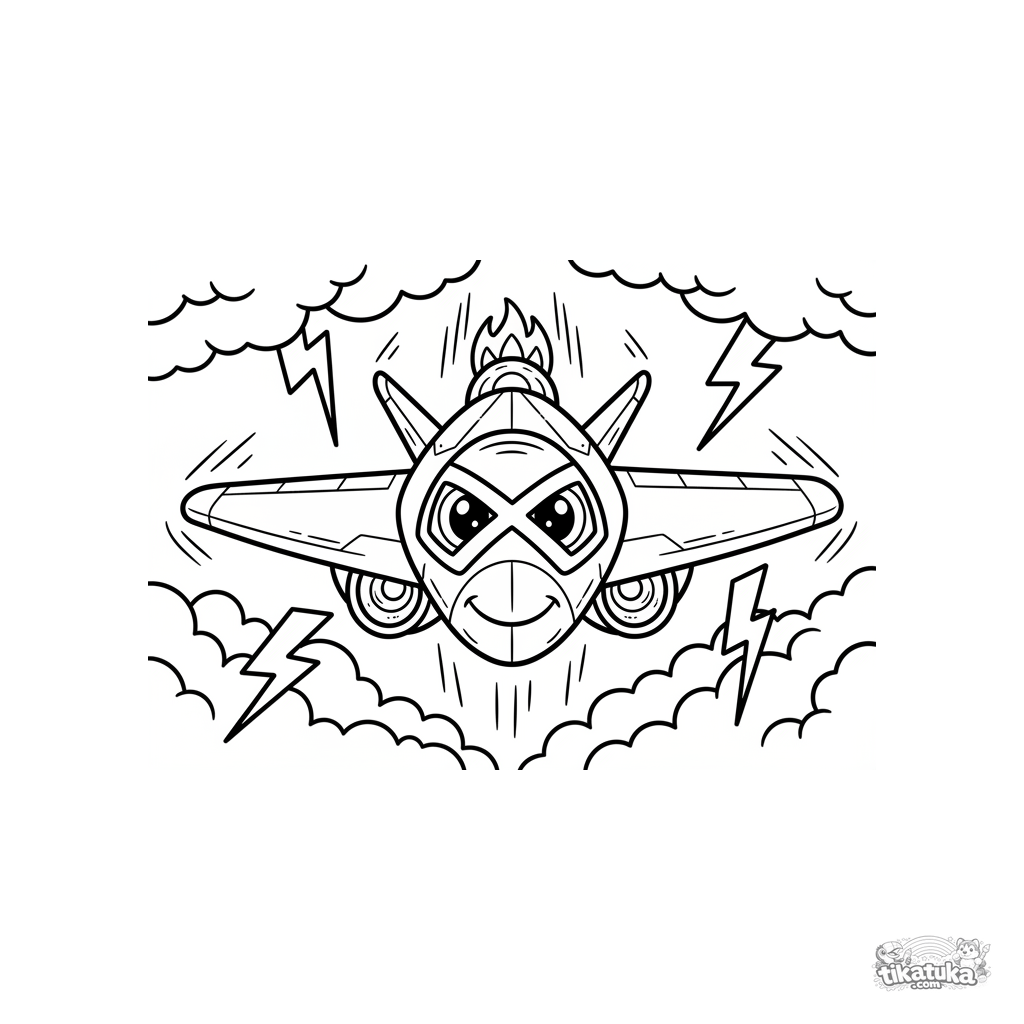 Página para colorir dinâmica de um jato futurista voando através de um céu tempestuoso. Para crianças de 7 a 9 anos. Estilo de quadrinhos, iluminação dramática.