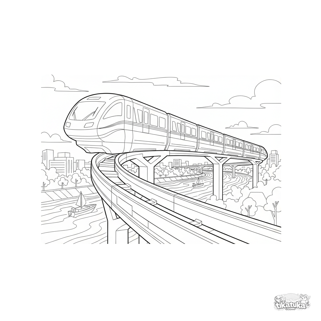 Página para colorir detalhada para 10-12 anos: um trem monotrilho futurista em uma ponte sobre o rio. Design tecnológico limpo em estilo técnico.