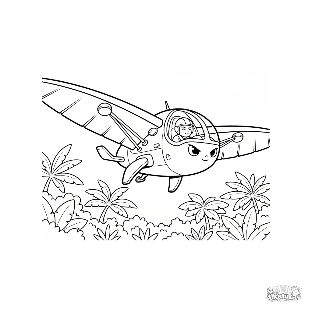 Página para colorir de um ornitóptero futurista com asas mecânicas, voando sobre uma selva. Design dinâmico inspirado em anime. Para 7-9 anos.