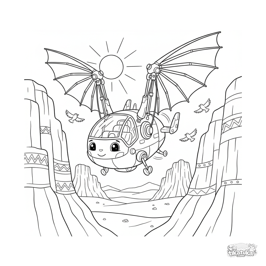 Página para colorir para crianças mais velhas 10-12: um ornitóptero futurista com asas batendo sobrevoa cânions desérticos.