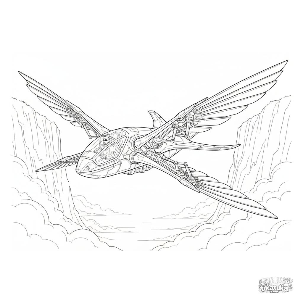 Página complexa para colorir no estilo de planta baixa: um ornitóptero futurista com asas batendo voa através da névoa entre penhascos. Para 10-12 anos.