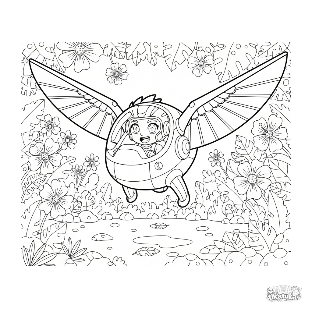 Página para colorir para pré-adolescentes de 7-9 anos: um ornitóptero futurista com asas batendo como pássaro paira em uma clareira na selva. Um piloto de capacete olha para flores exóticas.