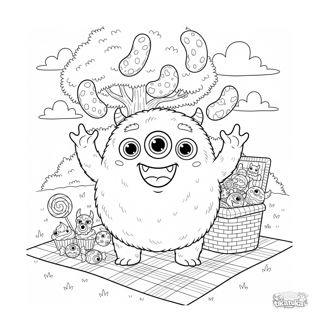 Página detalhada para colorir para crianças de 10 a 12 anos: um monstro peludo malabarizando jujubas em um piquenique. Textura realista de pelo.