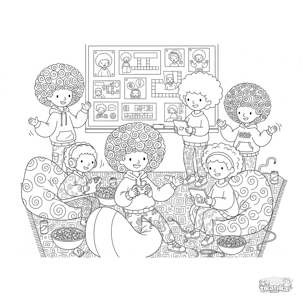 Página para colorir vibrante para 10-12 anos: uma equipe de desenvolvimento de jogos em brainstorming em uma sala de estar no porão. Quadro branco com esboços, protótipo de controle, puffs.