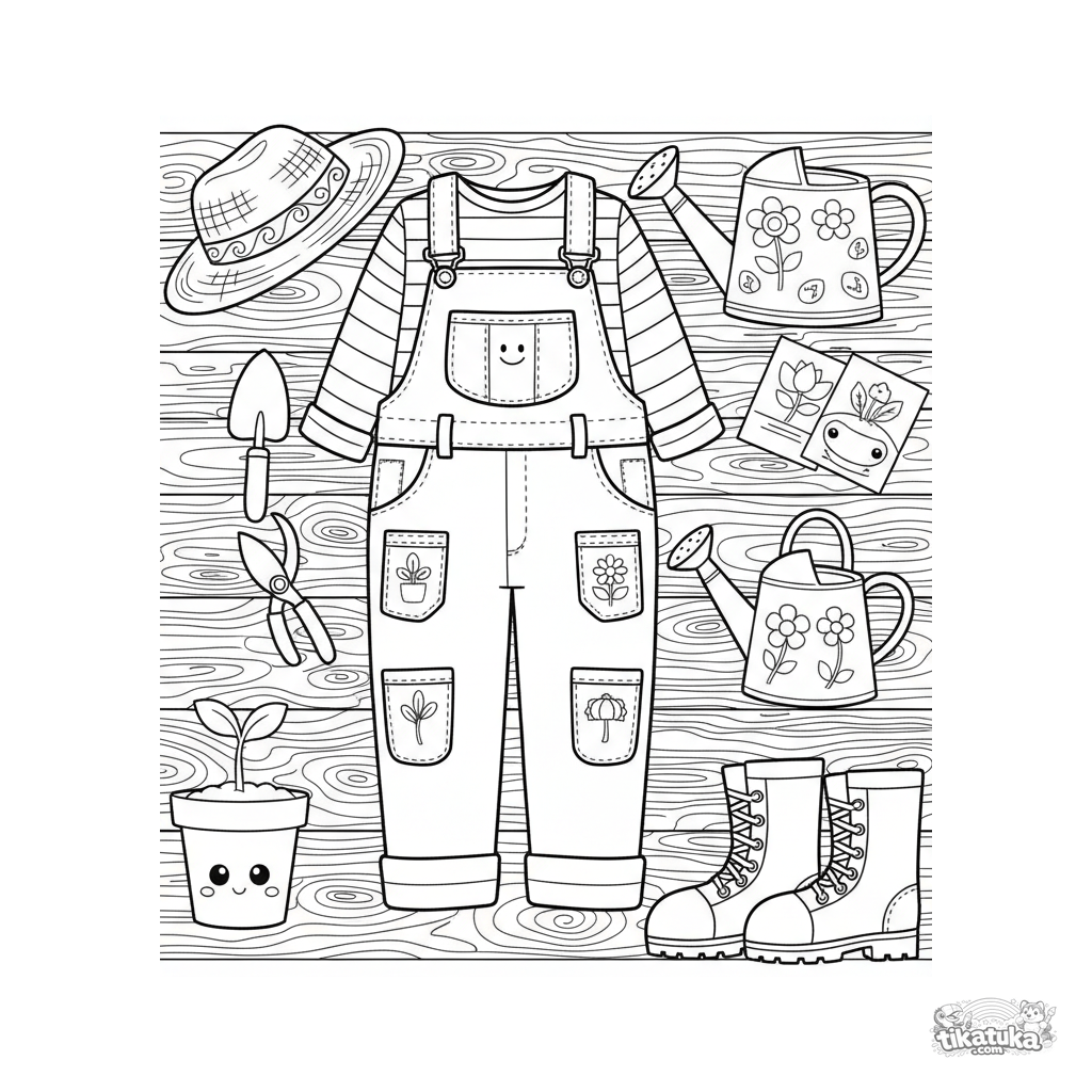 Página para colorir estilo caderno de esboços para 10-12 anos: uma roupa de jardinagem e ferramentas dispostas sobre uma superfície de madeira. Muitos bolsos, texturas e objetos pequenos.