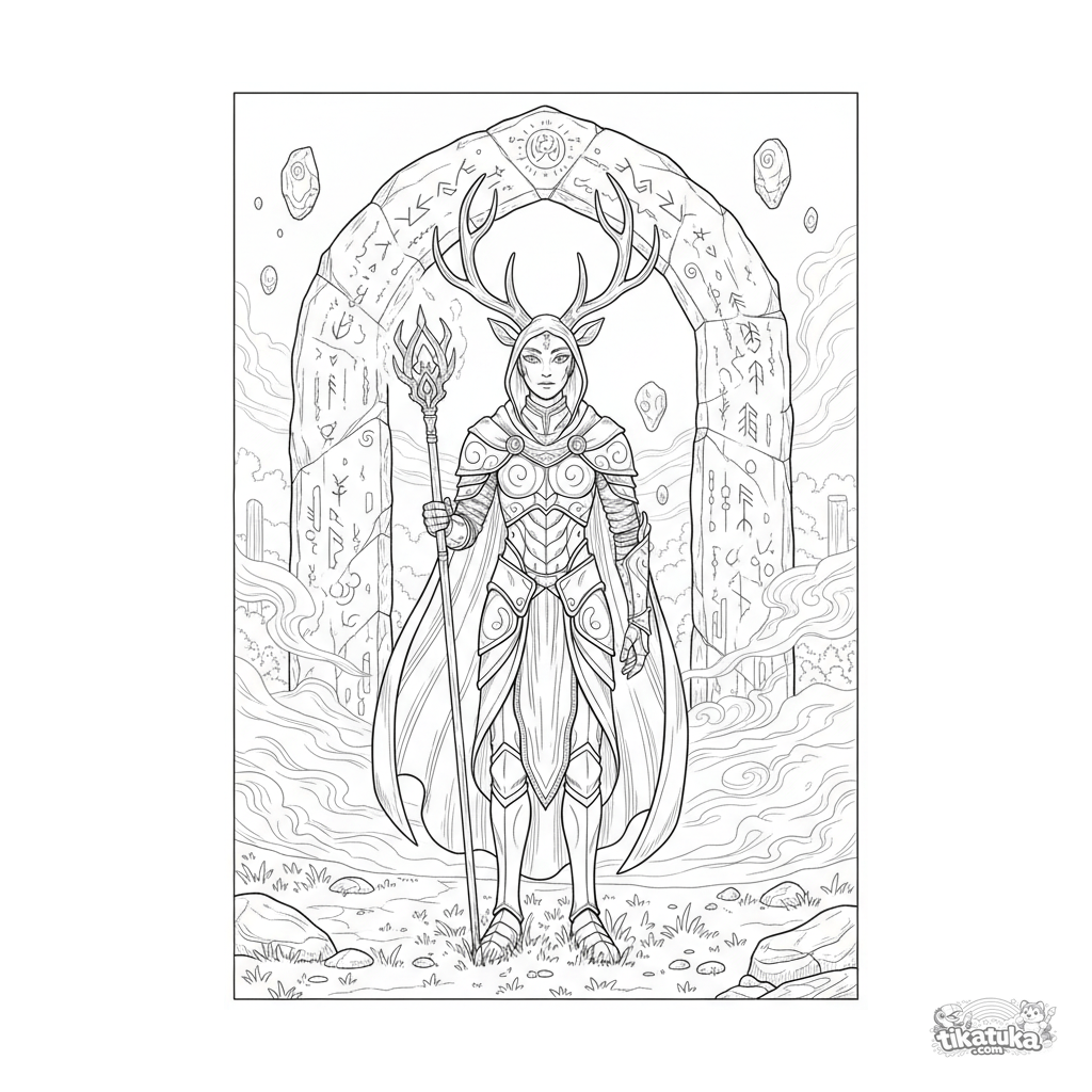 Página para colorir detalhada para crianças mais velhas 10-12: um guardião majestoso com chifres de veado guardando um portal antigo de pedras flutuantes com runas brilhantes.