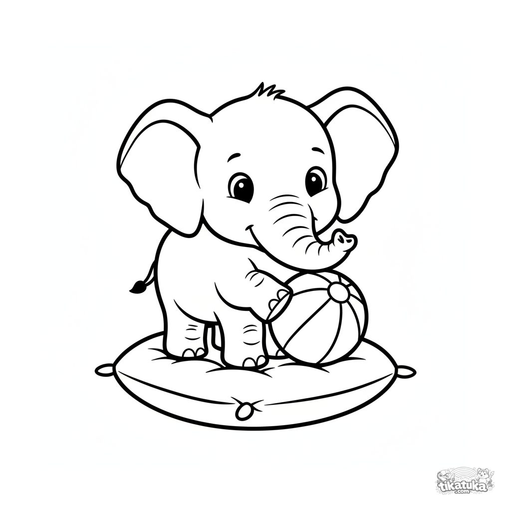 Página para colorir para crianças de 2-3 anos: um bebê elefante gentil fica em pé em uma almofada segurando uma bola grande com sua tromba. Formas claras, realistas, mas simples com grandes detalhes.