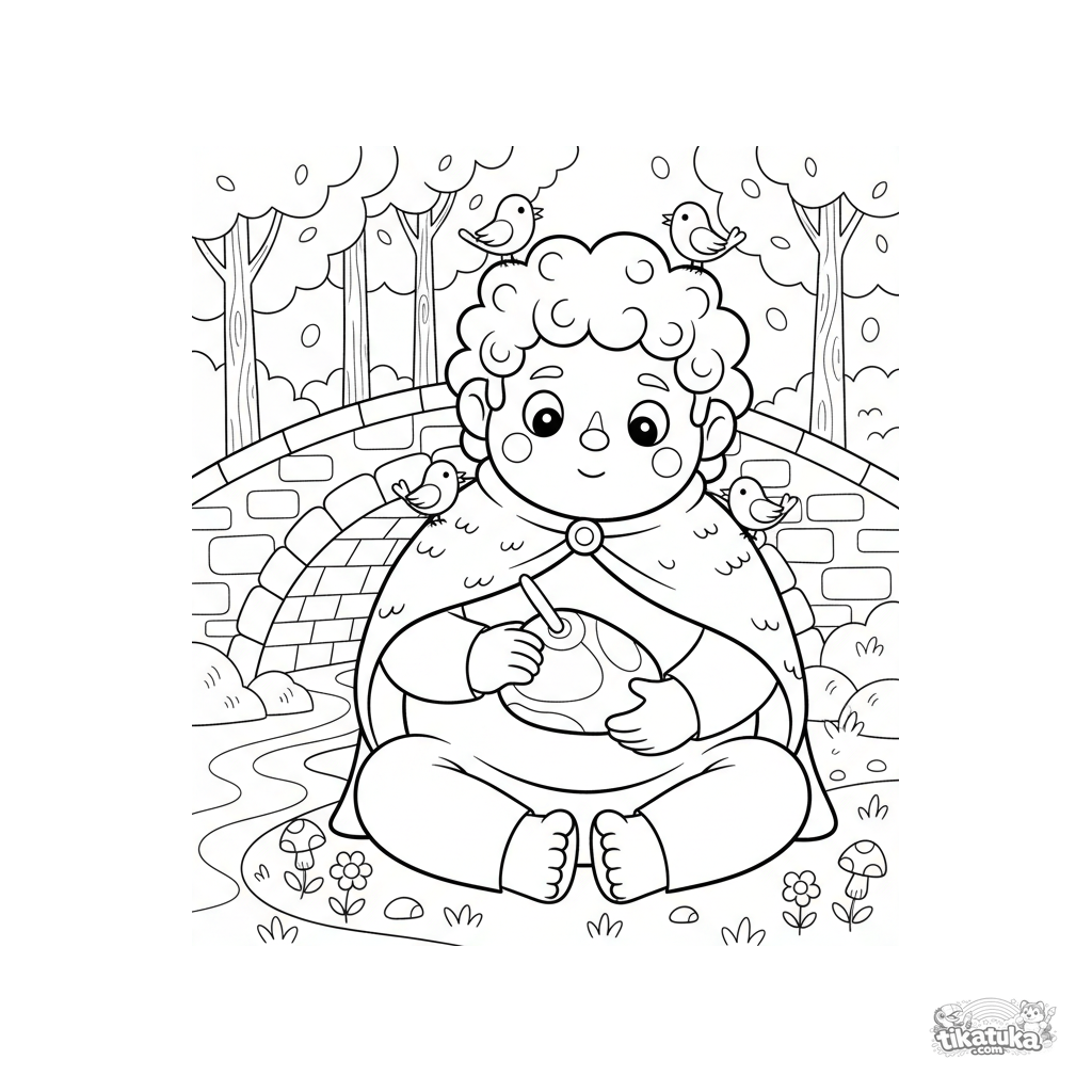 Página para colorir para crianças: um gigante gentil e musgoso senta-se junto a uma ponte de pedra em uma floresta antiga, polindo uma pedra enquanto passarinhos pousam nele.