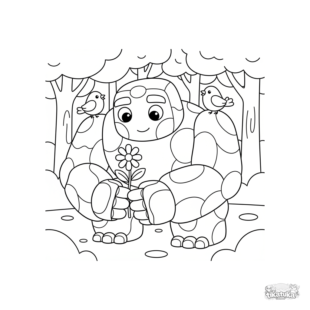Página para colorir simples para crianças pequenas 2-3: um golem de pedra grande e amigável em uma floresta segura cuidadosamente uma pequena flor silvestre. Formas grandes, poucos detalhes.