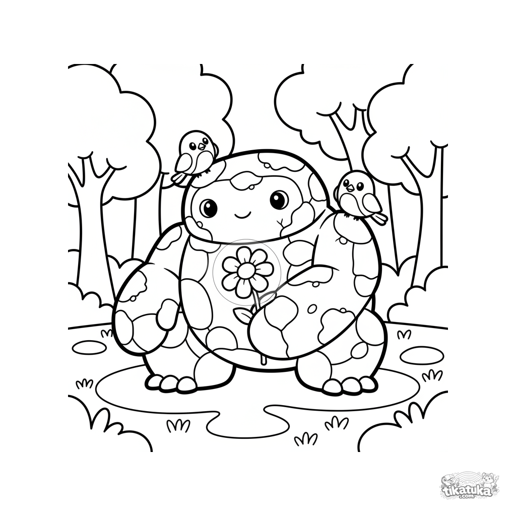 Página para colorir simples para crianças pequenas 2-3: um grande golem de pedra gentil agachado em um prado, segurando uma flor brilhante.